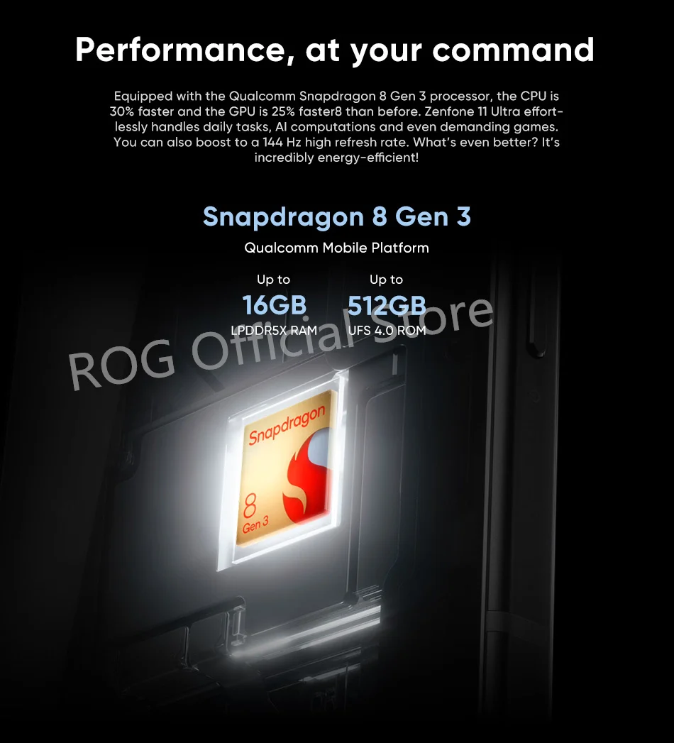 Equipped with the Qualcomm® Snapdragon® 8 Gen 3 processor, the CPU is 30% faster8 and the GPU is 25% faster8 than before. Zenfone 11 Ultra effortlessly handles daily tasks, AI computations and even demanding games. You can also boost to a 144 Hz high refresh rate9. What’s even better? It’s incredibly energy-efficient!