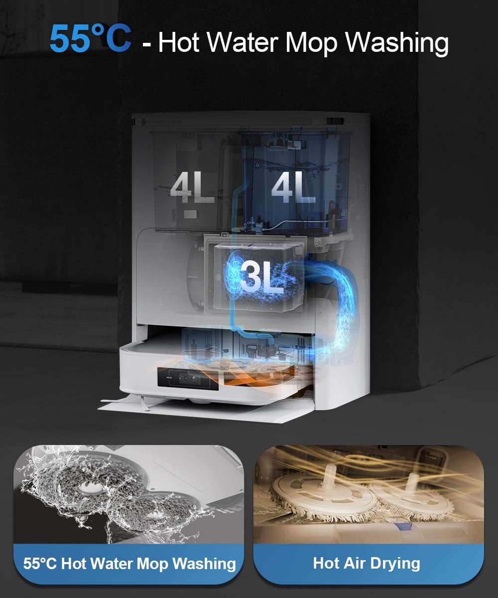 8000PA Strongest Suction (Auto Clean+Auto Empty) Deep Sweeping and Mopping,15mm Auto-Lift Mopping, 55°Hot Water Mop Washing and 6400mAh Battery